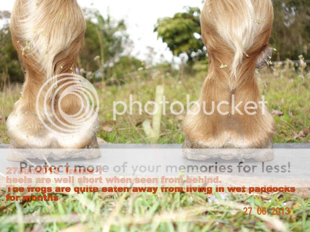 The frog on this back foot just spurted blood when I tried to take a thin sliver of the side of the frog to remove a little tag of skin. The frog is really mushy although not hot. He is sore on that foot when walking. I can’t work out whether the frogs are eaten away from the continuous wet paddocks or what. There certainly isn’t any thrush in them cos there’s no smell or powdery stuff or moist slimy patches, etc. But it is normal for the frogs on all my horses to get like this all through the wet season & in a wet winter. Then in spring when the weather gets drier they fill out again. This winter is shaping up to be wet with a heap of rain coming tomorrow & staying for the next week. Just what the horse’s feet need. I do use Thrushbuster regularly on their feet but the problem is not always some sort of thrush.